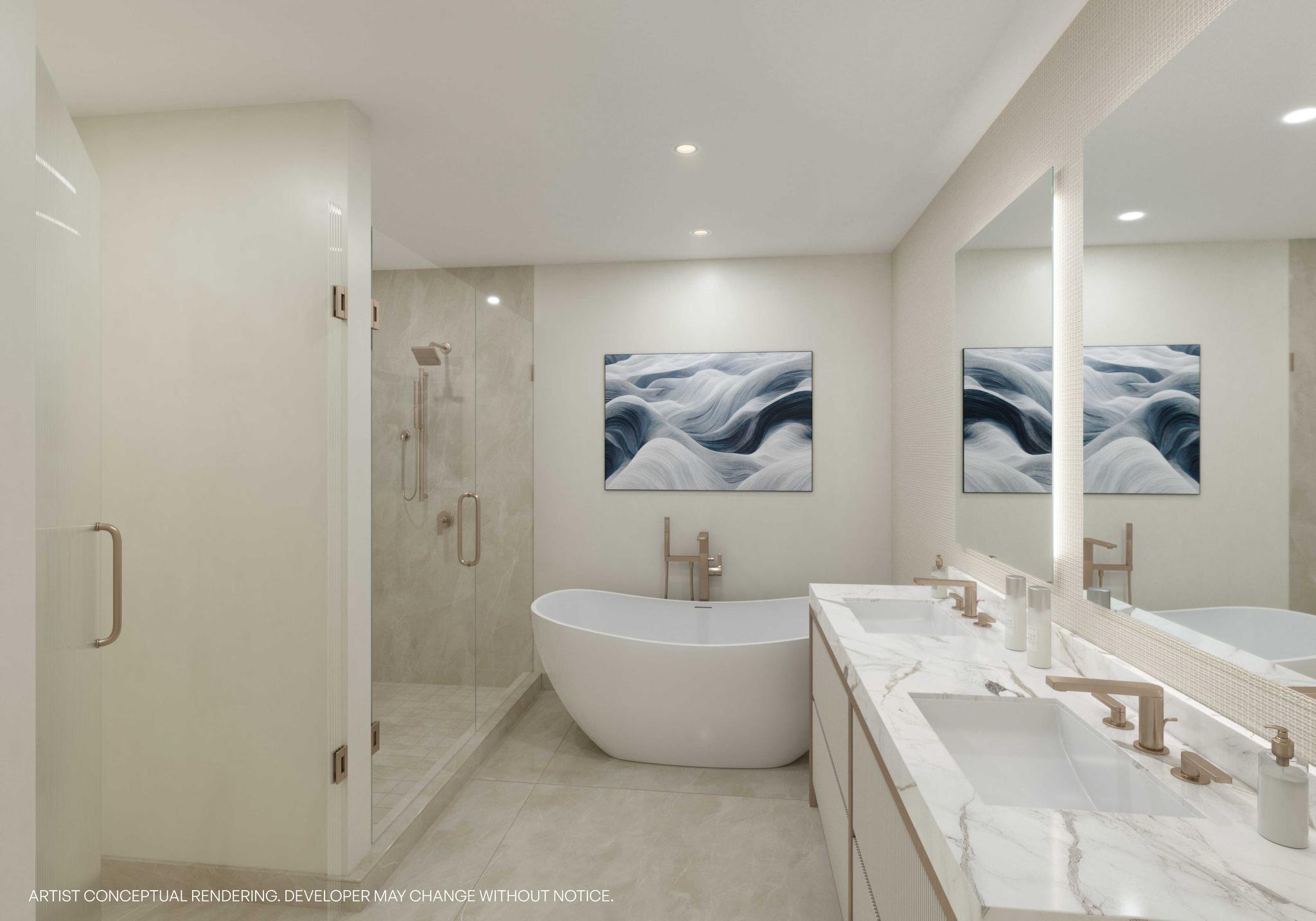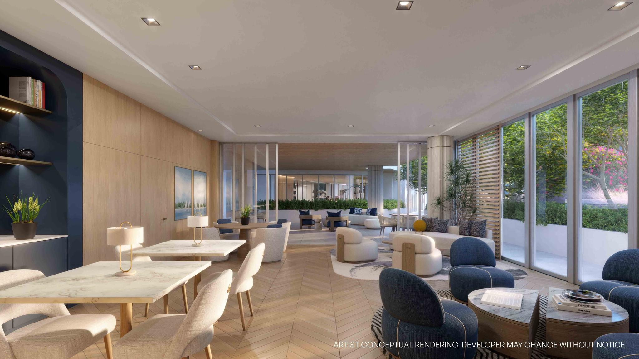Developed by Northlink Capital and designed by the acclaimed Revuelta Architecture International, 7200 Collins is defined by its fluid lines and ocean-facing form. The building’s signature curved façade allows for panoramic views and sunlight to permeate each residence, while glass-wrapped balconies connect the indoors to the natural beauty outside. Inside, interiors by Adriana Hoyos Design Studio bring warmth and sophistication to every detail, from Italian cabinetry and glazed porcelain tile flooring to bespoke furnishings selected for modern, elevated living.