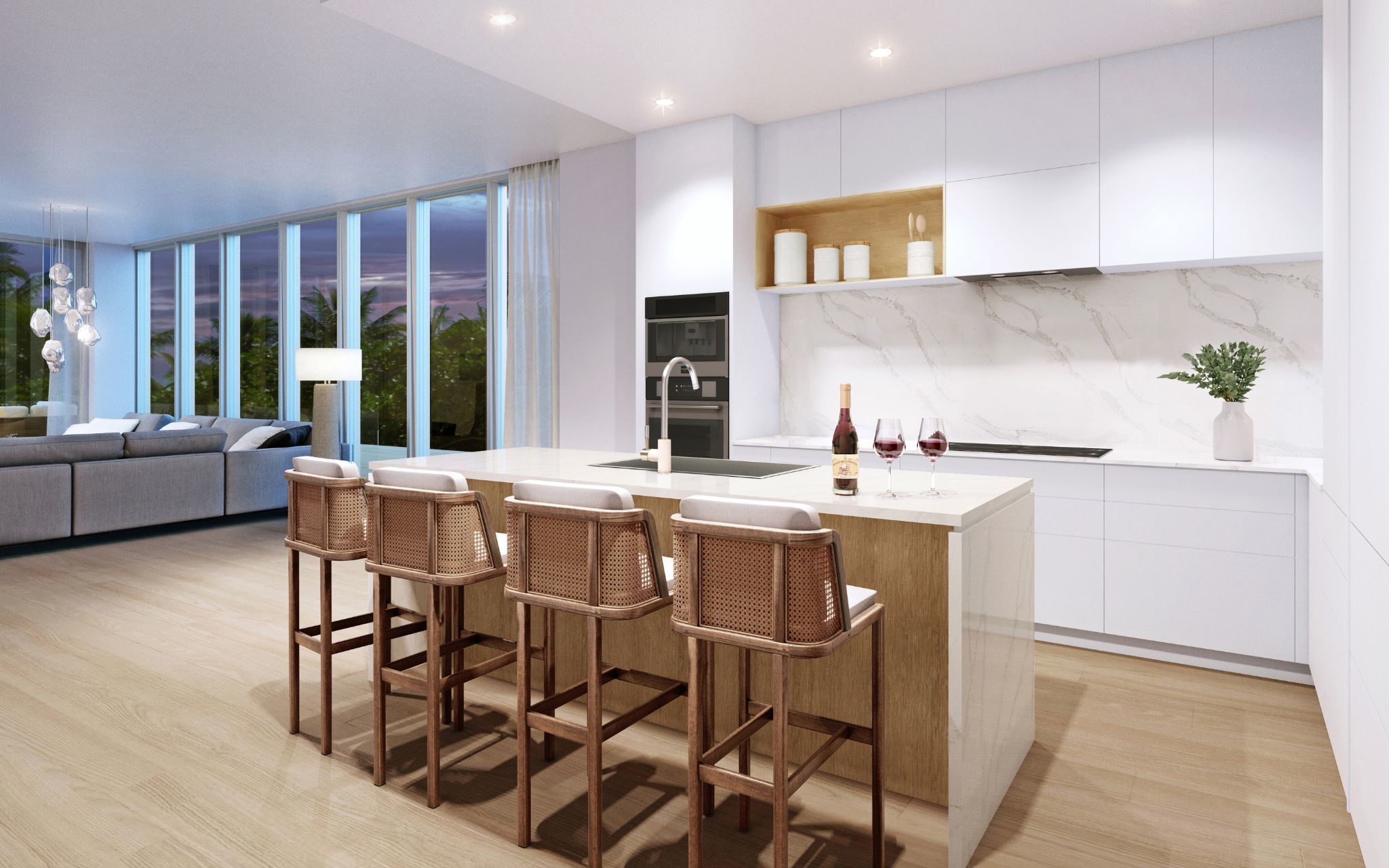 Step into these elegant residences adorned with light solid Oak wood flooring throughout. The Poliform kitchens, complete with Matte Touch cabinets, Silestone Calacatta grooved water fall edge countertops, and back-splashes, create a perfect blend of style and functionality. High-end Wolf and Sub-Zero' appliances, including a refrigerator, oven, microwave, dishwasher, and wine refrigerator, complement the gourmet kitchen experience.