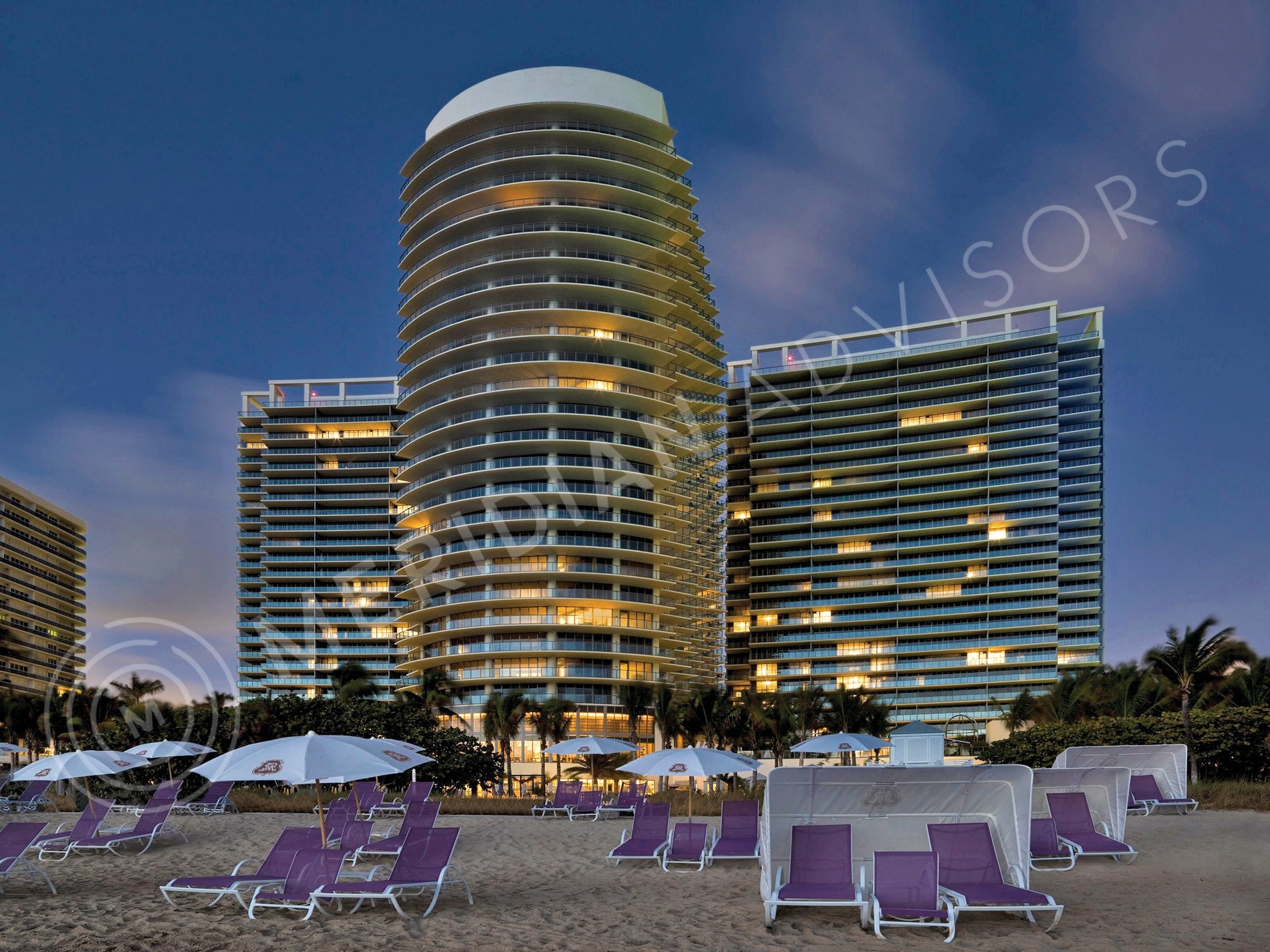 As you approach Bal Harbour’s St. Regis Residences, the property’s lavish entry experience greets you warmly, with elaborate fountains and reflecting pools along a dramatic approach drive. The St. Regis’s sprawling gardens surround a trio of towers, consisting of two residential buildings and a central hotel. Along the property’s sensational 600 linear feet of manicured beachfront, the beautiful people of Bal Harbour relax and take their hair down among the aquamarine waters of the Atlantic Ocean.
